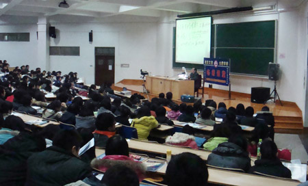 陈文灯教授在给同学们讲课辅导 12月11日晚,文昌院112教室座无虚席。中央财经大学数学部主任、享受国务院特殊津贴的著名考研数学辅导专家陈文灯教授,给Beat365官网学生作了一场考研中的数学问题讲座。 陈教授的助理首先向同学们介绍了我国目前的考研形势,指导同学如何树立正确的考研目标。其幽默诙谐的语言,深入浅出的讲解使同学们受益匪浅。 陈教授在讲座中强调指出 “掌控数学,研究生非你莫属!”,接着就近几年考研数学出题模式作了深入地分析。并例举了一些典型案例,结合自己的经历为大家讲述了考研的心得和经验,使同学们对考研的数学复习有了更深刻地认识。 最后,同学们纷纷上台与陈教授交流,陈教授也就大家提出的疑问耐心地作了解答。 本次由经管系分团委和学生会主办的讲座,让同学们对考研数学有了全方位的了解,同时指导大家如何设定合适的考研目标,增强了同学们考研的信心和决心。