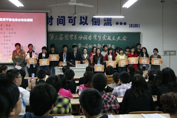 2010年10月14日下午5:30,经济管理系分团委、学生会首届优秀部门评比活动在文昌院103教室顺利举行。本次活动由经管系分团委组织部承办,经管系分团委宣传部,网络编辑部协办。分团委副书记冯雪堃担任主持,经管系党总支书记黄苏宁老师,分团委书记羊栋老师及原联席会成员担任评委。