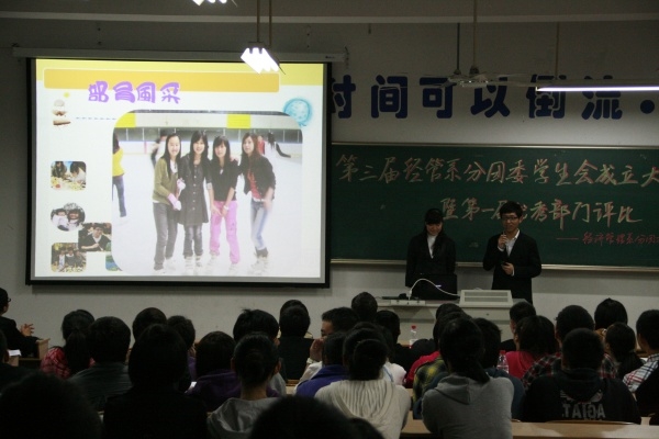2010年10月14日下午5:30,经济管理系分团委、学生会首届优秀部门评比活动在文昌院103教室顺利举行。本次活动由经管系分团委组织部承办,经管系分团委宣传部,网络编辑部协办。分团委副书记冯雪堃担任主持,经管系党总支书记黄苏宁老师,分团委书记羊栋老师及原联席会成员担任评委。
