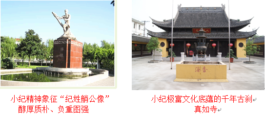 千余载的岁月沧桑,给小纪留下了古镇韵味。始建于唐、重建于宋的古刹真如寺,1984年被列为省重点文物保护单位;广济庵是一代高僧、新加坡佛教协会主席释隆根法师出家的地方;磨子古街、清代典当、古桥等,见证了小纪沧海桑田的千年历史。