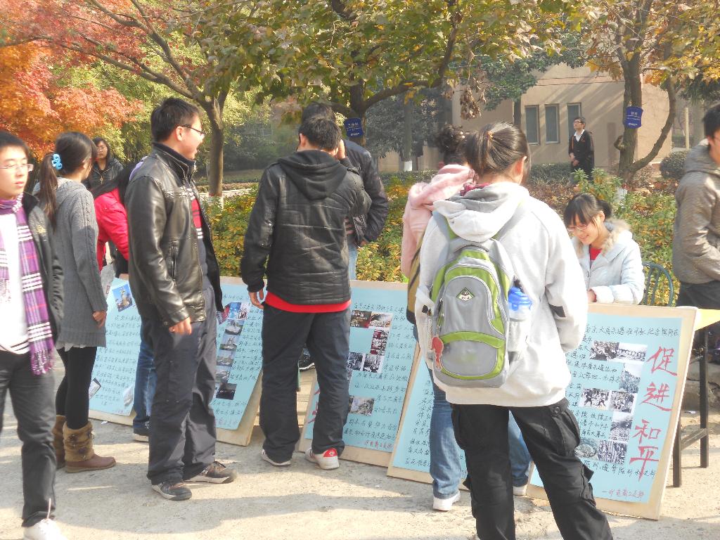 次日中午,我支部在校英语角附近设立了反映南京大屠杀事件的展板,将当时最真实的现状展示给大家,因为我们坚信只有还原真相,认识真相,才能警醒世人,戳穿跳梁小丑们的画皮。活动中我们还拉起了长达12米的“勿忘国耻教训,携手共创和平”宣传横幅,用文字表达我们最真挚的祝福,同时我们还用DVD记录了前来签名,留下祝福语的每一位老师和同学的身影,用镜头传递我们最由衷的缅怀。整个现场气氛很火爆,大家都积极投入到宣传活动中。