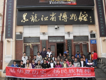 在活动前期,同学们都踊跃的参与宣传工作,比如海报,活动主题等等。101061班怀着激动的心情来到了黑龙江省博物馆,馆内展示着各种各样的珍品。有远古时代的,近代的等等。让同学们的视野得到一次很大的冲击和满足。时间很快,快到关馆的时间,同学们依依不舍的离开,集合在博物馆门口留下了永久的纪念。还在“品华夏历史,扬民族精神”的红幅上,签上自己的名字。