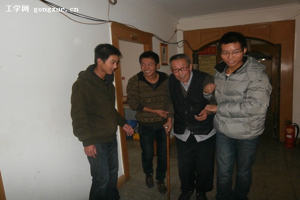 还有就是班长和其他几位男生搀扶老人下楼,这位老人平时需要看护人员的照顾,因为腿脚不方便。正是今天我们来了看护人员也轻松不少。