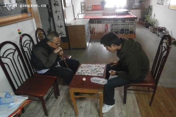 接下来是我们班刘学聪同学陪老爷爷下象棋,本想是哄哄老人,但不时冥头思索,想着如何破解老人的一招招棋。结果被老人家当孩子哄了,也不乏一丝趣味。