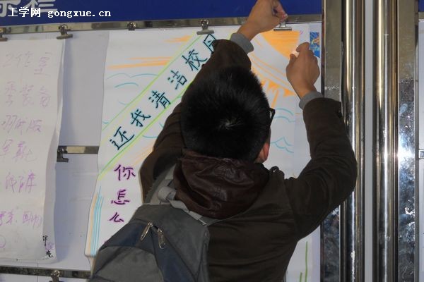 周三,由王亚州同学带领的小组进行了活动的前期宣传活动。主要形式是自行设计和制作海报,然后张贴在各教学楼的公告栏内,因海报内容设计极佳,引起了同学们的广泛关注。接着,周六上午由杨晓珊同学带领的小组进行了校园的美化清洁活动。这项活动由欧冠官网金手指服务队和我班团支部联手开展。双方在活动前做了详细的计划工作,整个过程进行顺利,双方合作十分融洽。
