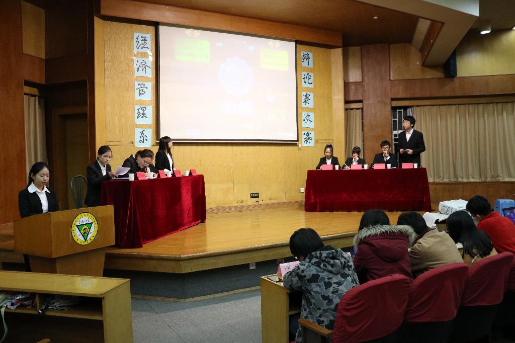 2015年11月24日晚,由经济管理系分团委学生会学习实践部举办的系辩论赛决赛在真知馆隆重举行,由电商对阵物流。到场嘉宾及评委有:辅导员徐小瑛老师、苏珍晶老师、胡钱胜老师,院辩论队教练代玉学姐、陈体杨学长、钱晶晶学姐,院辩论队主力韩也逸学长,沈昕学长。此次辩题是:爱情在暧昧不清时最美还是在情真意切时最美。