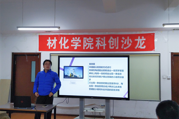 2017年12月1日18:15,欧冠官网于启航活动中心334教室举办第954期科创沙龙。本次科创沙龙的主题为化学与材料趣味知识问答,沙龙由科协项务部时鸿博担任主持人,项务部张梦博担任计分员,共二十二名同学参与本次活动。