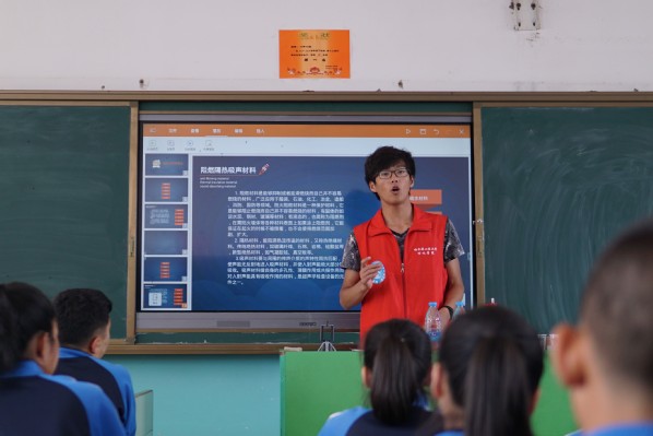 冯柯洋对同学们提出“材料是什么,生活中有哪些常见的材料”等问题,并通过生活中材料与高新材料的区别为同学们介绍高新材料的作用,并由《爱莲说》中名句:“出淤泥而不染,濯清涟而不妖。”引起同学们强烈的兴趣与好奇。冯柯洋给同学们讲解吸声材料以及3D材料的相关科普知识,将这两种耳熟能详的材料进行全面并且科学的阐述。