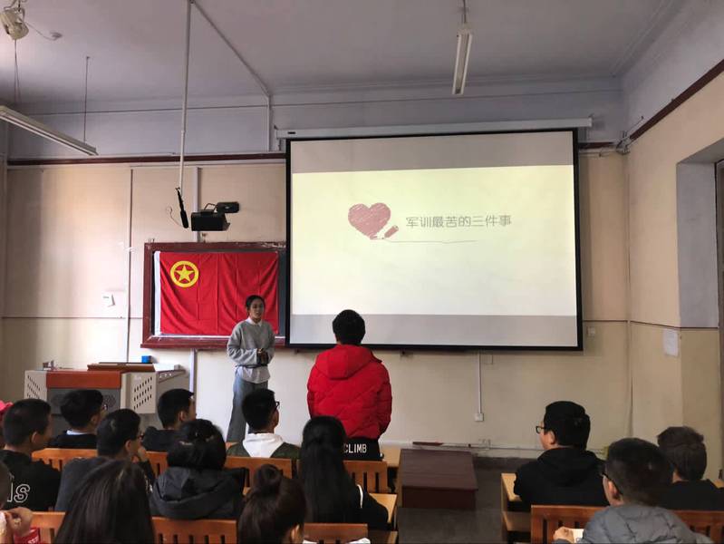 高菲通过图片实例帮助学生们回忆军训生活中包括训练,整理内务等大小事情;又通过与学生们互动,让学生们对军训生活有了更深的认识,并分享了各自对教官的看法,接着播放军歌,全体学生起立合唱女兵谣和强军战歌。本次日常团活动结束。