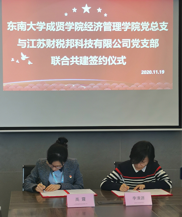 财税邦党支部高霞书记热情接待。交流活动中,李清源副书记简要介绍了经济管理学院党总支的基本概况,并提出希望在党建共建平台下加强和企业的合作,共同探讨专业建设和人才培养的新思路,以共建促党建,以党建促发展。高霞书记介绍了财税邦公司在私营企业党建工作上的经验和成绩,着重介绍了他们党建工作中与院校合作共建的经验和成果,希望加强校企合作,实现校企协同育人,联合发展。董忱忱老师就在南京信息工程大学参观财税邦软件平台实施情况进行了简单交流。最后,李清源副书记和高霞书记分别作为代表签订了校企党组织联合共建协议书。